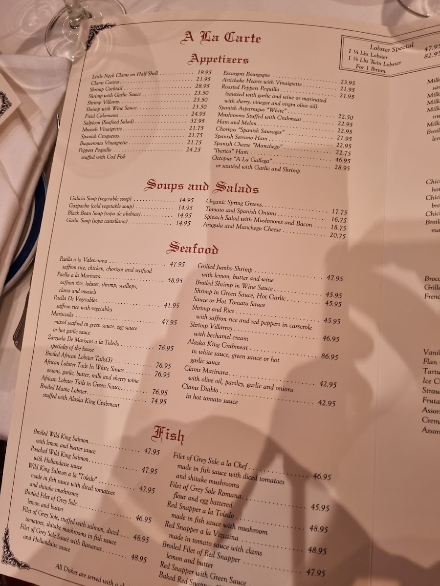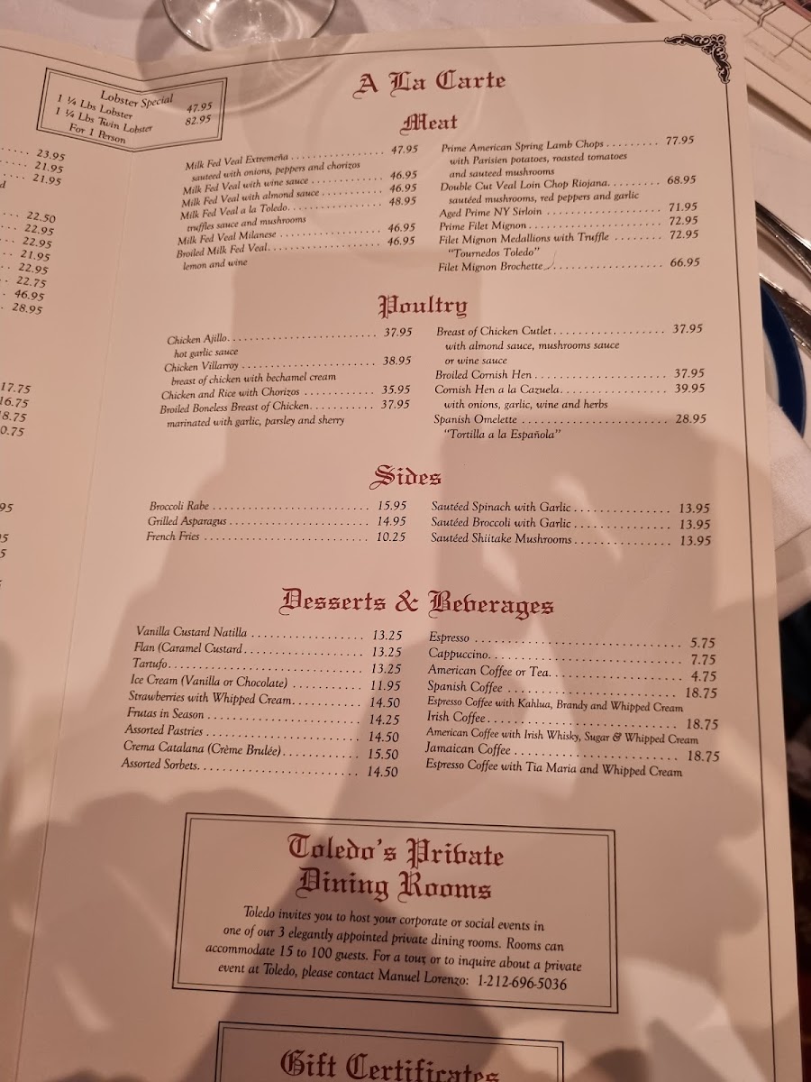 From a reviewer’s perspective, the menu at Toledo Restaurant offers a well-rounded and classic Spanish dining experience, with a strong emphasis on traditional flavors and variety. The appetizers like Little Neck Clams on Half Shell, Clams Casino, and Shrimp Cocktail set a fresh and indulgent tone, while warm starters such as Shrimp with Garlic Sauce and Shrimp Villaroy add richness. The soups and salads, including Galicia Soup, Gazpacho, and Black Bean Soup, provide comforting and authentic options. Seafood lovers will appreciate signature dishes like Paella a la Valenciana, Paella a la Marinera, and Zarzuela De Mariscos a la Toledo, which highlight the kitchen’s expertise. The fish selection, featuring Broiled Wild King Salmon and Filet of Grey Sole Stuffed with Salmon, continues this theme of refined preparation. For heartier choices, the meat section showcases standout items such as Milk Fed Veal a la Toledo and Milk Fed Veal Milanese, while poultry dishes like Chicken Ajillo and Chicken Villarroy round out the offerings. Finally, desserts like Flan, Tartufo, and Vanilla Custard Natilla provide a sweet and satisfying finish. Overall, the menu feels cohesive, traditional, and satisfying, even without listed prices.